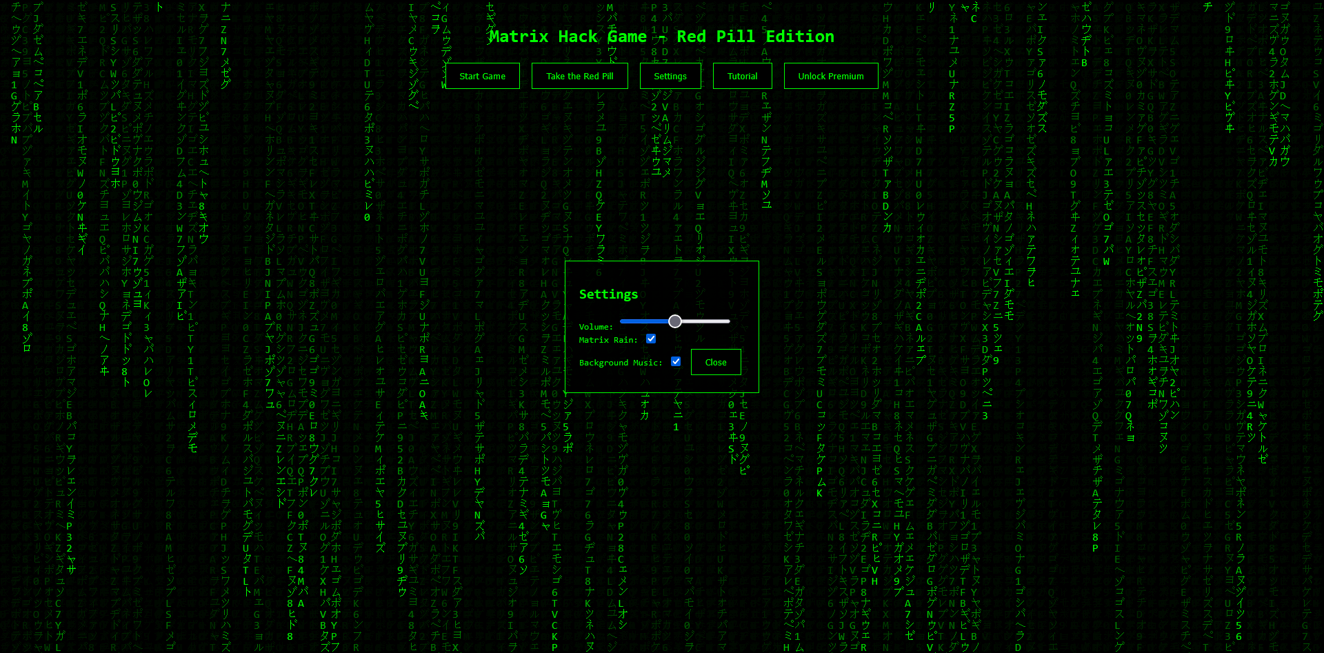 ⚙️ Adjust volume, toggle matrix rain animation 🌧️, and control background music.